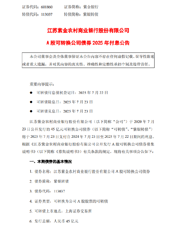 7月15日金融一线消息,江苏紫金农村商业银行股份有限公司发布A股可转换公司债券2025年付息公告,公司于2020年7月23日公开发行的45亿元可转换公司债券将于2025年7月23日支付自2024年7月23日至2025年7月22日期间的利息。